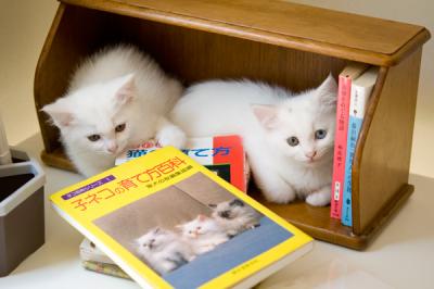 右の猫はまろ眉があって、左右の目の色が違うオッドアイです。薄いブルーの目の色が綺麗でいつも見とれてしまいます。