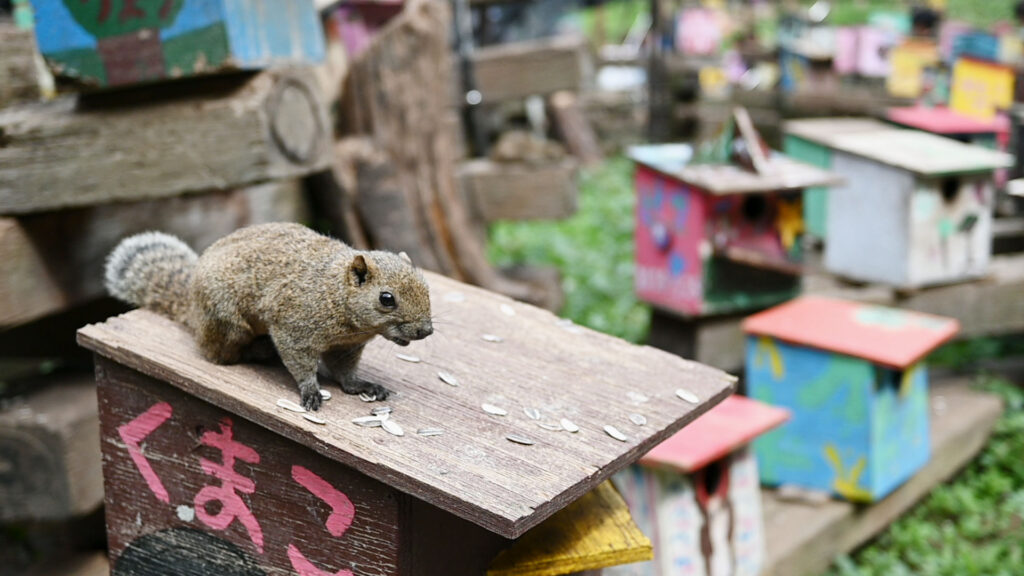 手作りのリスハウスが並び、上空から鳥に狙われないようにネットが張られ、リスは広い空間でのびのび過ごしています。ここはリスの楽園。